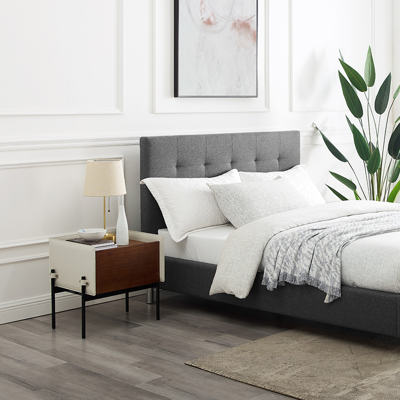 Modern éjjeliszekrény természetes fa minimalista fából készült bőr éjjeliszekrény rozsdamentes acél lábával